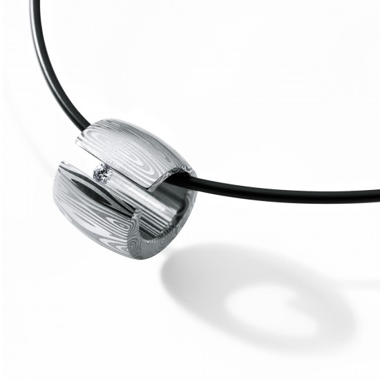 Dem Damaszener-Edelstahl wird eine legendäre Haltbarkeit nachgesagt. Zusammen mit einem Brillanten entsteht ein aussergewöhnlich schönes Schmuckstück.