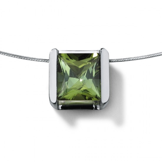 Die Seiten des Anhängers sind mattiert. Die Vorderansicht und die Innenflächen sind poliert und reflektieren somit das Licht. Der Stein wird durch die Spannung in der Fassung gehalten. So wirkt es, als ob der grüne Turmalin schweben würde.